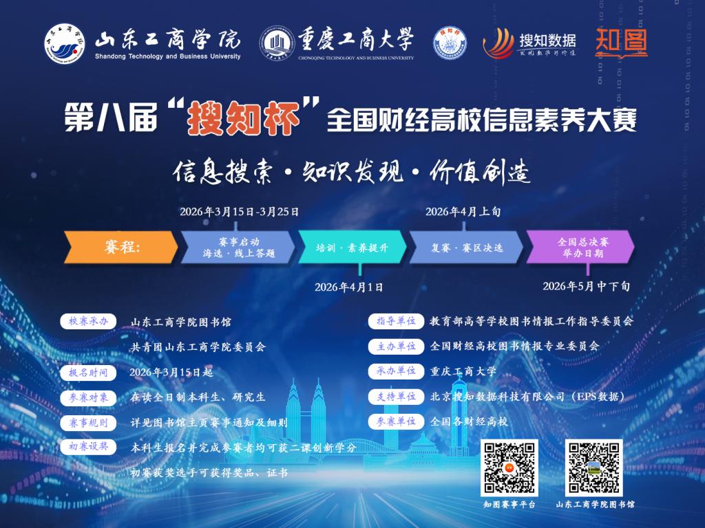为推动高等学校大学生信息素养通识教育,培养大学生检索、分析与利用信息的能力,激发大学生的学习热情,第八届“搜知杯”全国财经高校大学生信息素养大赛——山东工商学院初赛将于2026年3月15日启动,欢迎本科生、研究生积极参加。