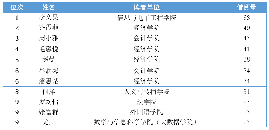 2025年信息与电子工程学院的李文昊同学借阅图书63册,位居榜首位。我校本科生读者全年共计借阅图书8907册。