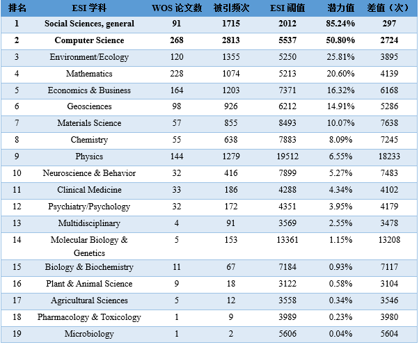 我校潜力值排名前两位的社会科学、计算机科学潜力值超过50%,与上一期比较,被引频次差值和潜力值均呈现较大的提升。